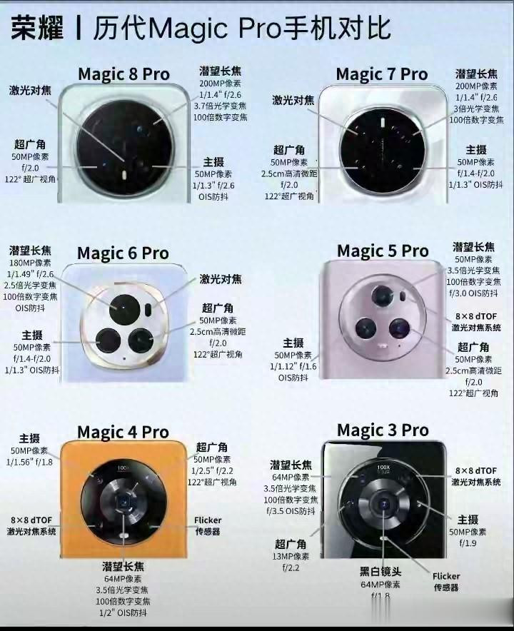 2026年3月,荣耀Magic Pro全系列后置镜头对比图照旧发布,哪一代拍照最强一目了然。总结荣耀Magic Pro系列的发展过程,从2022年的Magic 4 Pro到2025年的Magic 8 Pro,每一代皆在影像系统上进行深度探索与工夫迭代,造成了瓦解的进化眉目。本文将按照时代公法,详备解析Magic 4 Pro、Magic 5 Pro、Magic 6 Pro、Magic 7 Pro及Magic 8 Pro的后置录像头树立与影像实力,匡助破钞者在2026年的时代节点上,直不雅了解哪一代家具在拍照性能上发达最为特出。