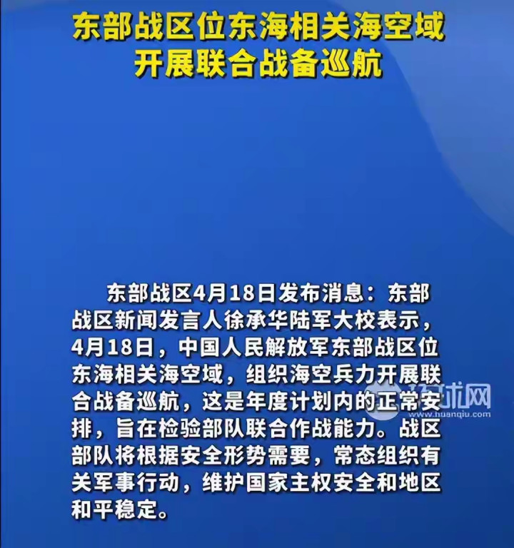 东部战区新闻发言东说念主徐承华陆军大校晓谕:4月19日,中国东说念主民解放军东部战区组织133号舰艇编队过航横当水说念,赴西太平洋海域开展演训行径。