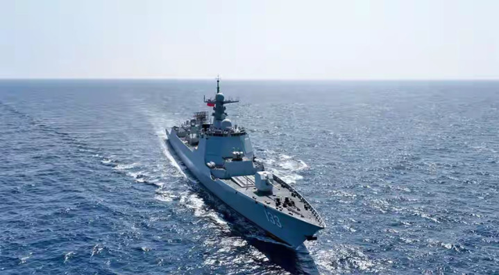 一艘052DL革新型导弹收场舰,满载排水量7500吨,配备130毫米单管主炮、64格通用垂直放射系统——这等于“包头舰”,舷号133。
