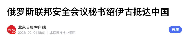 2026年2月1日,俄罗斯联邦安全会议秘书绍伊古的身影出现在北京。