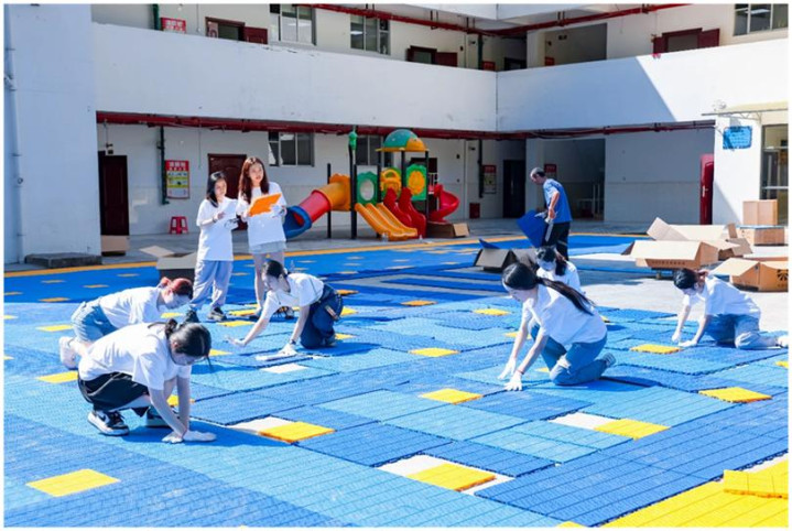 美团员工公益志愿者们正在为广西巴马瑶族自治县西山乡中心幼儿园铺设捐赠的新操场