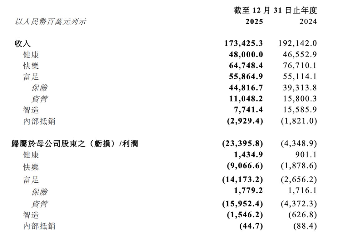 财报流露,2025年四大中枢业务板块收入为1282.4亿元,占总营收的74%。但集团全体营收仍同比下滑9.74%,中枢板块的局部发扬,无法对消全体业务的败落趋势。