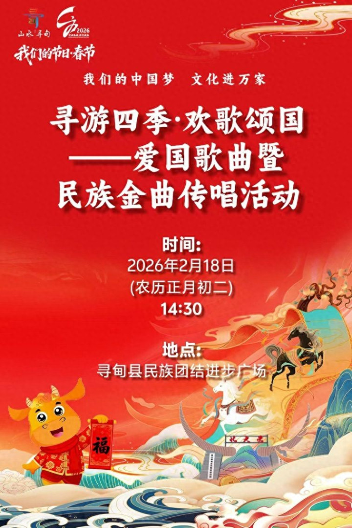 歌声献故国,欢歌庆新春。2026马年春节,寻甸县将举办寻游四季·欢歌颂国爱国歌曲暨民族金曲传唱举止,以经典旋律积贮爱国情愫,让新春广场充满鼓吹进取的期间气味。