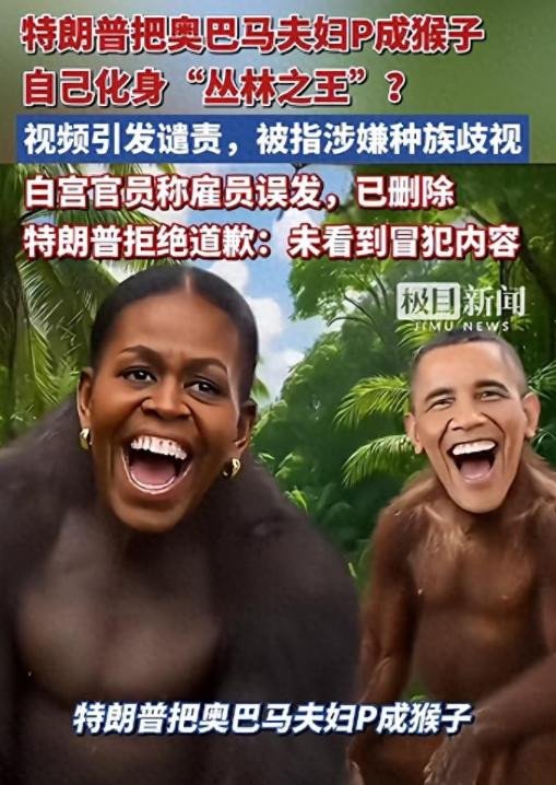 事情的导火索,是特朗普近期转发的一条争议视频,视频里,奥巴马和妻子米歇尔的头像被坏心编著到灵长类动物身上,低俗又失礼,已而引爆好意思国公论。